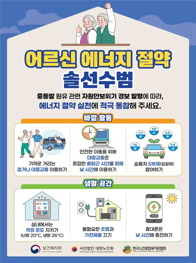 정부는 어르신들이 생활 속에서 실천할 수 있는 6가지 에너지 절약 행동을 선정해 집중 홍보한다. 주요 내용으로는 가까운 거리 걷기와 대중교통 이용을 장려하되, 안전을 위해 혼잡한 출퇴근 시간을 피한 낮 시간대 이동을 권고한다. 또한 승용차 5부제 동참, 적정 실내온도(난방 20°C, 냉방 26°C) 유지, 낮 시간대 휴대폰 충전, 불필요한 조명 및 가전제품 끄기 등의 내용이 담겼다. 관련 홍보물은 전국 행정복지센터와 경로당, 노인복지관 등 주요 이용 시설에 배포한다.