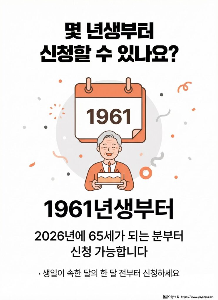 2026년에 65세가 되는 1961년생 어르신부터 신청이 가능합니다.