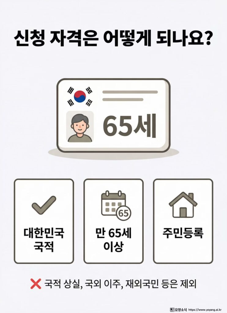 만 65세 이상인 자 중에 대한민국 국적이 있으면서 다른 나라의 영주권·시민권을 취득한 복수국적자이면서 주민등록이 되어있는 자, 사회복지전산관리번호를 부여받은 자, 주민등록표에 거주불명등록자로 등록된 자 등