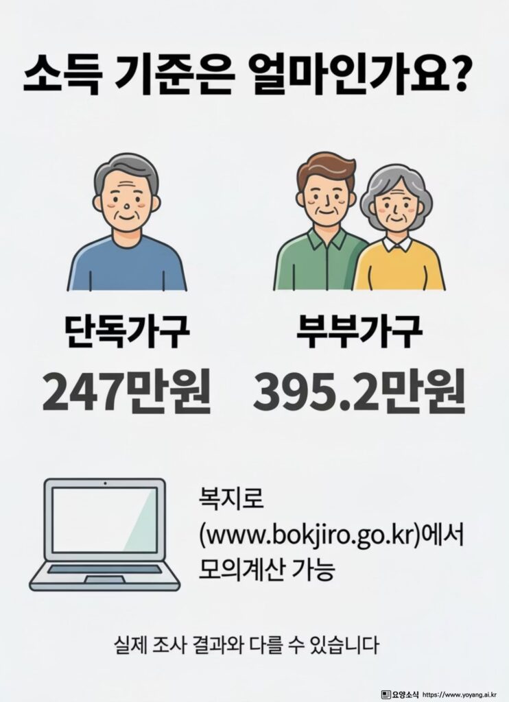 ※ 모의계산 가능: 복지로(www.bokjiro.go.kr) > 모의계산 > 기초연금에서 자신의 소득·재산 내역을 입력하여 수급 가능여부를 확인해볼 수 있습니다. 다만, 실제 조사결과와 차이가 있을 수 있습니다.