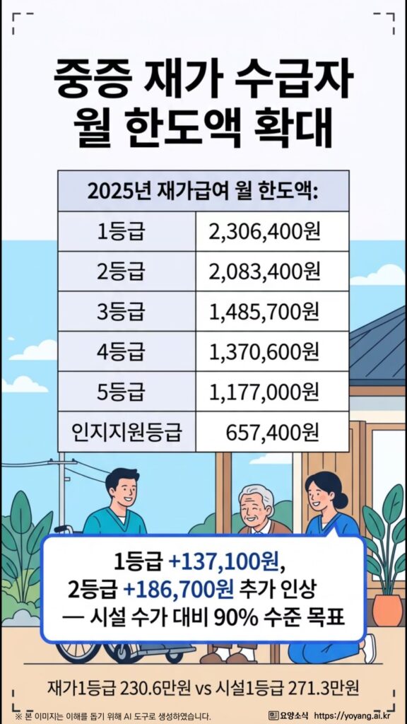 집에서 돌봄을 받는 1·2등급 중증 수급자의 월 한도액을 추가로 인상한다. 구체적으로 1등급 수급자는 기존 대비 137,100원을, 2등급 수급자는 186,700원을 각각 추가 인상하여 시설 입소 시와 유사한 수준의 서비스를 집에서도 누릴 수 있도록 지원한다. 이는 어르신들이 살던 곳에서 노후를 보내는 ‘에이징 인 플레이스(Aging in Place)’를 실현하기 위한 조치다.