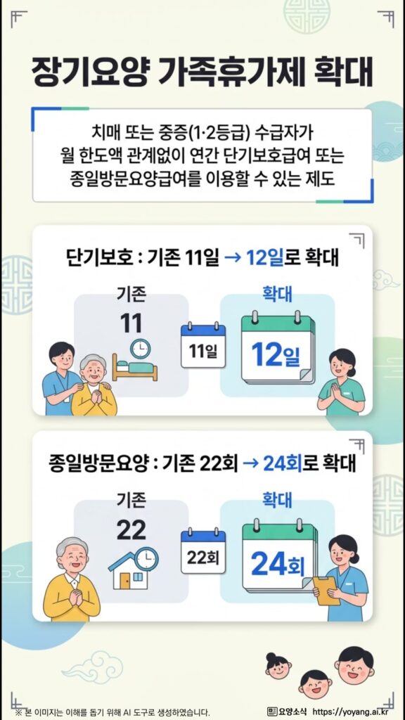 가족의 돌봄 부담을 덜어주는 ‘장기요양 가족휴가제’도 확대 운영한다. 기존 연간 11일이었던 단기보호 서비스 이용 가능 일수를 12일로 늘리고, 종일방문요양 이용 횟수 역시 연 22회에서 24회로 확대한다. 치매나 중증 수급자를 돌보는 가족들이 연간 최대 2주가량의 휴식 시간을 확보할 수 있게 된다.