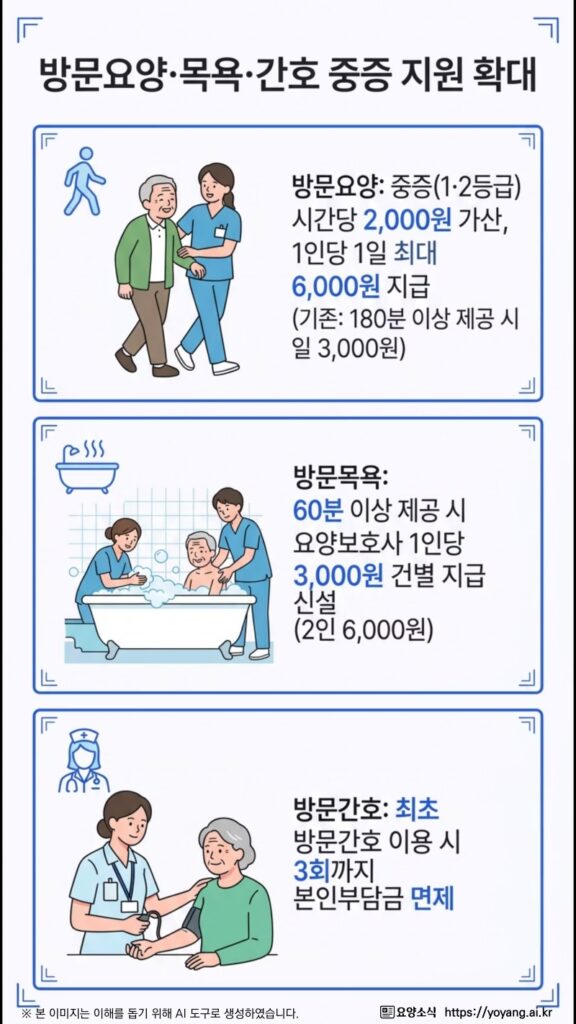중증 수급자에 대한 방문 서비스 가산 체계도 개편한다. 방문요양의 경우 1·2등급 수급자 가산 기준을 시간당 2,000원으로 변경해 1인당 하루 최대 6,000원까지 지급한다. 방문목욕 역시 60분 이상 서비스를 제공할 경우 요양보호사 1인당 3,000원의 건별 지급 항목을 신설하여 종사자의 중증 수급자 돌봄 기피 현상을 방지하고자 한다.
