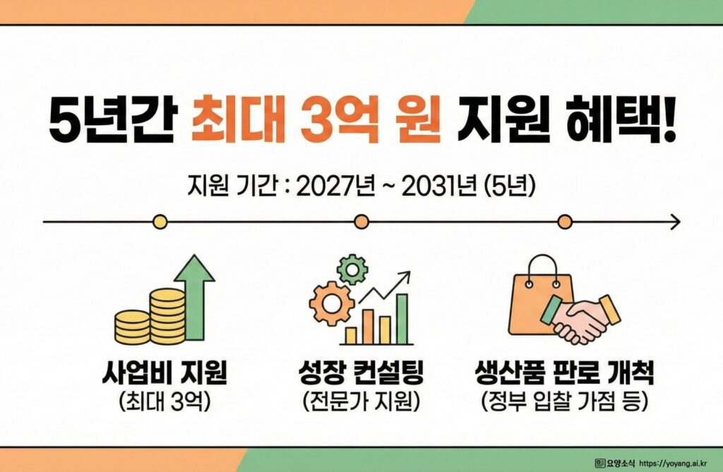 선정 기업 대상 최대 3억 원의 사업비 지원과 함께 성장지원 컨설팅, 생산품 판로 개척, 정부 입찰 가점 등 다양한 혜택 부여.