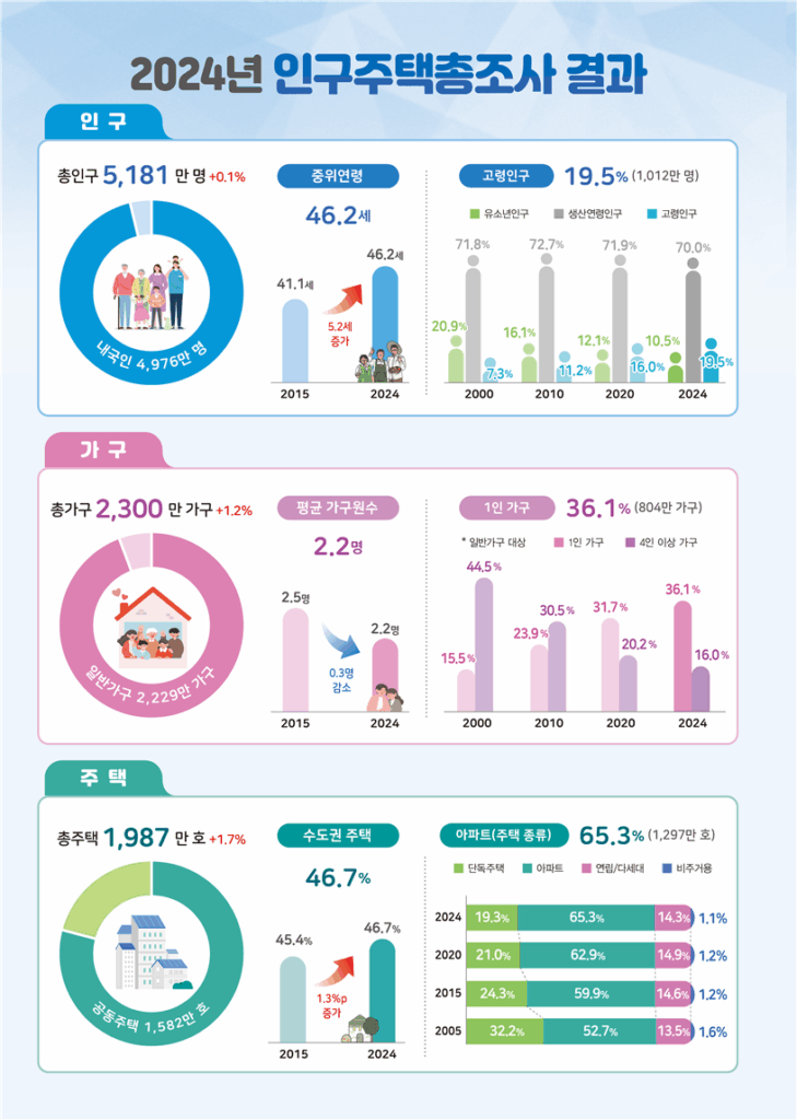 특히, 65세 이상 고령인구는 1012만2000명으로 5명중 1명은 고령자이다. 유소년인구 및 생산연령인구는 감소하고, 고령인구는 증가하고 있는 추세다. 따라서, 노령화지수(유소년인구 100명당 고령인구)도 186.7로 전년 대비 15.7이 증가했다.